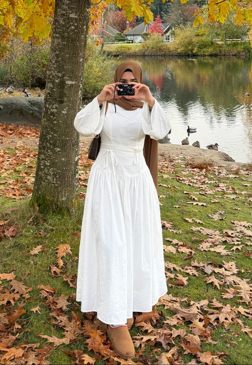 Inspired by modern Chinese fashion, The Sakura dress features a drop waist skirt to create a timeless silhouette, princess seams for structure, bell sleeves for elegance and finally two bow ties at the front for the feminine touch. For our modest woman we have made the dress fully lined and include a pocket!